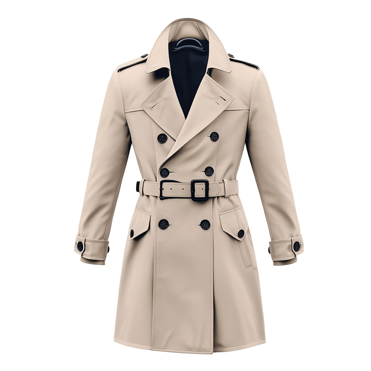 • Our mini trench coat offers a sleek, streamlined silhouette that's both comfortable and stylish. The double-breasted design and storm flap collar add a touch of classic sophistication, while the multiple pockets provide ample storage for your essential.