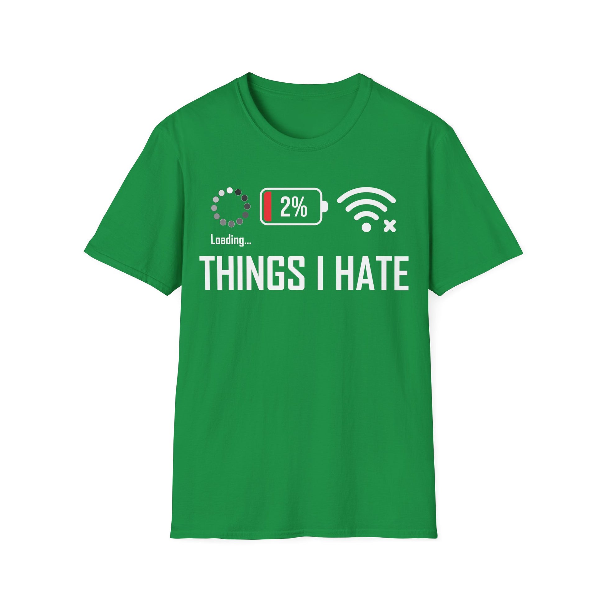 Don't let low Wi-Fi, slow loading times, and dying batteries get you down. Wear your frustrations with pride and let our "Things I Hate" t-shirt be your daily dose of humor and relief. Order yours now and join the rebellion!